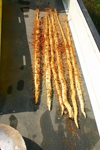 で、まきを使って炊いたご飯、炊飯ジャーとはちょっと味が違うかな今度はお米を串に付けていくよ